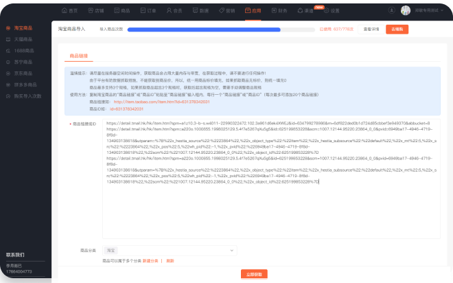 可批量导入商品信息,展示商品获取进度,获取完成后展