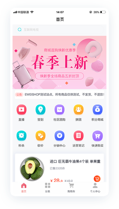 • 强大的自定义装修功能,页面所见即所得,快速打造移动商城